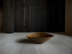The shallow conical form tapers to a fine point at the base, resting lightly on the surface. As the wood dried, it moved subtly, creating a gentle asymmetry that gives the piece its subtle character. Thin and light, the bowl carries a calm balance between precision and organic distortion.
