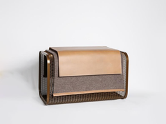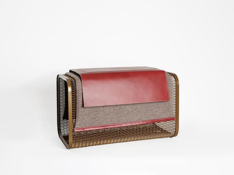 steel mesh bench in bronze finish with vegetable tanned leather cover over a wool woven and leather trimmed liner