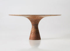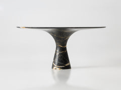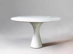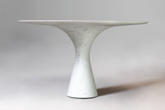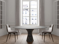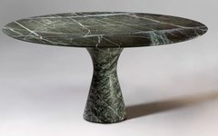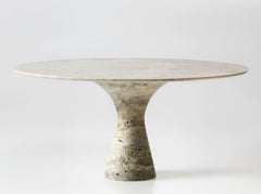 The design Angelo M is the essence of a round or oval table in natural stone, it features a sculptural form, sturdy material, an elegant line and a refined finish. Two elements, table base and top, form one whole together. The bottom is one running curve from table foot to edge. The conical connection creates a stable whole.