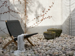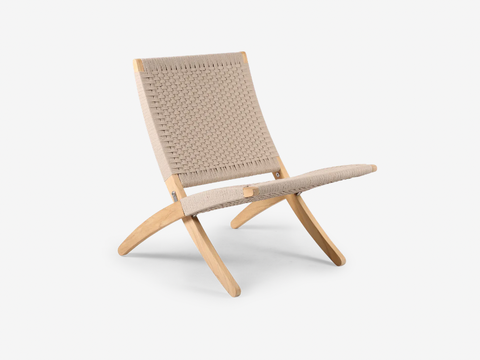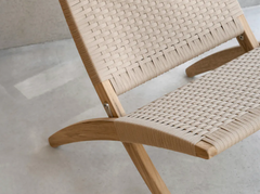 This folding lounge chair is ideal as an extra or permanent fixture. Its light and foldable frame can easily be hung on a wall or placed on a floor stand for convenient storage. Meanwhile, the chair has all the elegance of a sculpture with its natural materials, clean cotton webbing and evident craftsmanship. In short, it beautifully embodies the concept of complex simplicity.