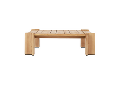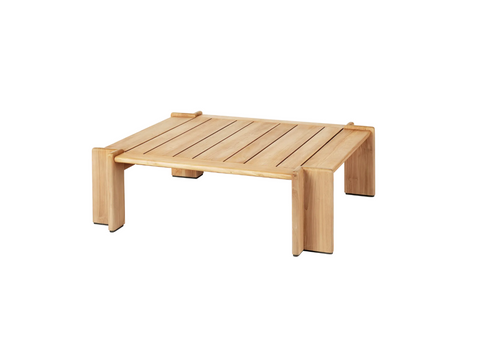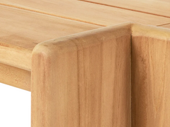 The tables’ simple aesthetics maintain an understated poise with a nod to classic references without being too formal. The tabletops are made from rhythmic, repeating slats of solid, premium teak, enclosed by a frame made from the same slats, giving a minimalist feel. The table legs are formed from two vertical slats, using a miter joint that creates an inverted ‘L-shape’ on each corner. Referencing architectural and maritime design, the unusual leg design provides both structural support and visual interest, giving the piece a certain lightness.