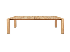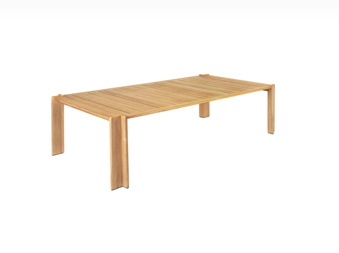 The tables’ simple aesthetics maintain an understated poise with a nod to classic references without being too formal. The tabletops are made from rhythmic, repeating slats of solid, premium teak, enclosed by a frame made from the same slats, giving a minimalist feel. The table legs are formed from two vertical slats, using a miter joint that creates an inverted ‘L-shape’ on each corner. Referencing architectural and maritime design, the unusual leg design provides both structural support and visual interest, giving the piece a certain lightness.