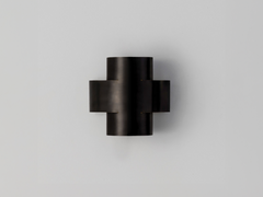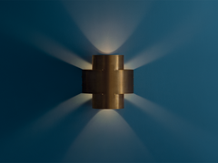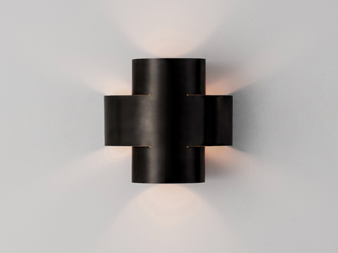 A 3-Dimensional plus is formed out of a single tube of brass that is cut, bent and finished. The light source nestled within emits soft beams of light showcasing its exceptional construction technique as embellishment. A compact form that multiplies to construct larger fixtures and individual wall hanging arrangements.