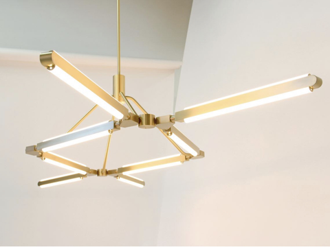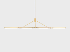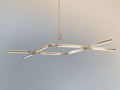 Named after the fembot character in the neo-noir film, Blade Runner, Pris is available in a series of configurations ranging from simple sconces to multi-dimensional chandeliers. Every fixture is an arrangement of machined linear arms, inset with LED light sources. These beams of light, joined by jewel-shaped connectors, are the defining elements of the Pris system. The double-sided LEDs create an immersive environment with warm light.
