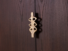 Layered chestnut and poplar wood panels for structural stability, sand-casted bronze handle