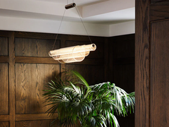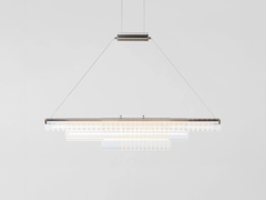 Coax is a coalescence of metal, glass, and light. The materials hang serenely, appearing weightless against each other. Cylindrical echoes of transparent glass surround a tube of light suspended in air.