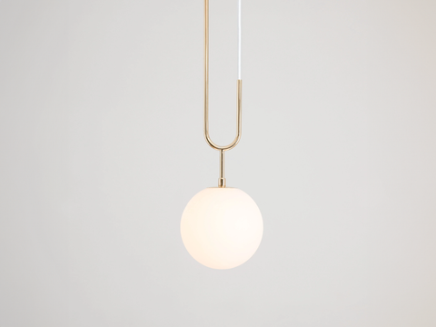 Drawing inspiration from a pearl pendant, the Koko collection is elegant and modern, with its luminous blown glass and brass arch detail.