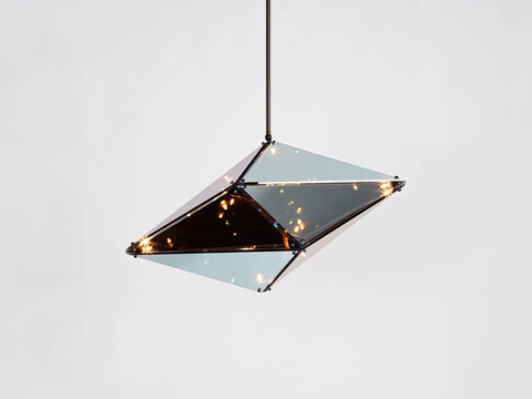 Bec Brittain's Maxhedron is a study in material transformation through light and reflection. When off, the partly-translucent Maxhedron reflects and blends with its environment; when on, the dazzling inner constellation of bulbs projects bands of light onto nearby surfaces.