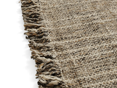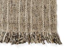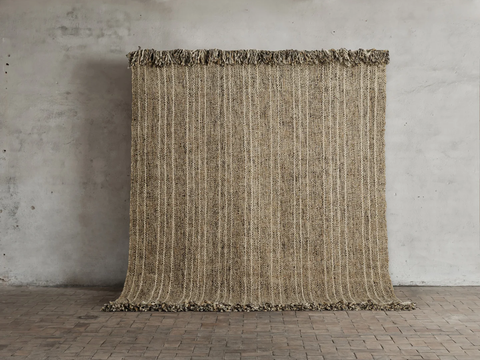 Rug no.20 has a mid-beige melange foundation with a soft sandy shaded stripe, creating a harmonious and delicate effect. This rug is designed with the warp running as fringe that elevates the design, providing extra details while exuding a serene ambiance in your room.
