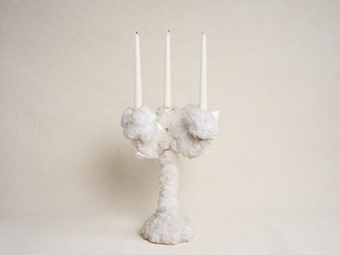 white natural grown crystals grown over reclaimed french brass candelabras