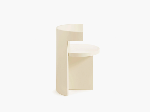 The solid form of the sculptural Boho chair offers a substantial yet graceful presence. The geometry of the cylinder is sliced to create a round seat, with a rounded back that rises and extends out to form two small arms along the top edge. The seat is supported by a single plane at a 45-degree angle to the back, creating a vertical rhythm that contrasts with the horizontal circles of the seat and back.