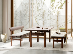 Shaped from solid, dark-oiled eucalyptus, the Asserbo Table exudes a simple stringency that alludes to the Shaker style. Designed in 1961 by Børge Mogensen to meet his own furniture needs, its gently rounded shape is punctuated with brushed brass screws. A piece with high utility value, the table is ideal for private and holiday homes, but also for restaurants and public spaces as a gathering point for meetings, meals and conversations.