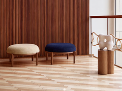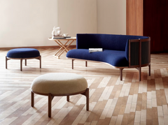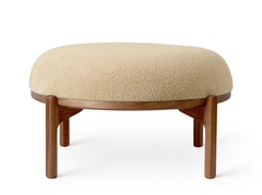 Sideways Footstool is designed by Rikke Frost. With organic shapes and an elegant mix of materials, it is a characterful addition to the Sideways Sofa. The frame in FSC-certified oak is combined with soft textile cover. The footstool can stand alone or be combined with other furniture, and it fits into both private homes and public spaces.