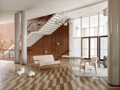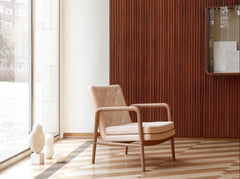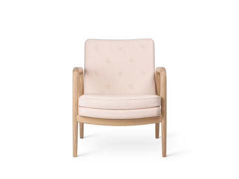 The Foyer Chair is characterized by a unique interplay between oak wood and upholstery, and the armrests are hand-polished with the utmost care to avoid the appearance of noticeable transitions. The Foyer Series was exclusively created by Vilhelm Lauritzen for Radiohuset in Copenhagen in 1945.