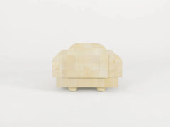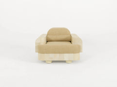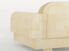 Architectural without formality, this Bauhaus inspired armchair features a unique parchment assemblage. The sculptural cushions are upholstered in the woven Angkor fabric from Parisian manufacturer Pierre Frey.