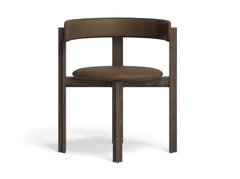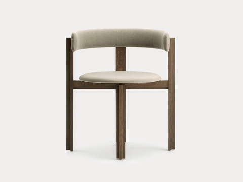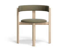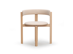solid oak or walnut with clear lacquer, HR foam seat and backrest, leather or fabric upholstery