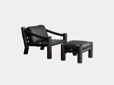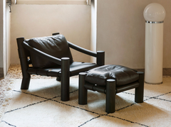 worked and polished turned solid wood, handcrafted leather frame, goose-down padded cushion, leather upholstery