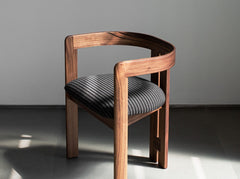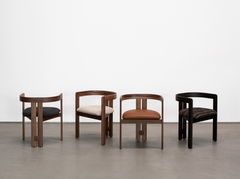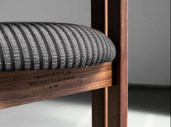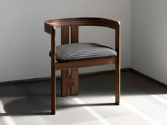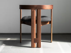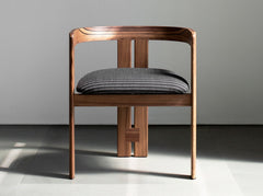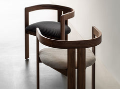 Tacchini’s exclusive re-edition of Pigreco in Canaletto walnut, walnut-stained ash and charcoal grey ash, with leather or fabric seat covering, bears the mark of the great architect.