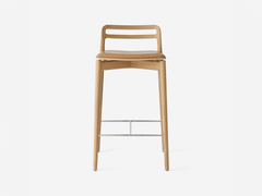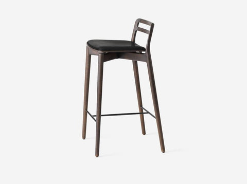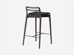 Vipp Cabin counter stool is made for a kitchen counter. This counter stool features rounded components of solid oak and a hovering veneer seat with an affixed cushion in black leather. The supportive footrest of steel ensures stability.