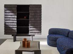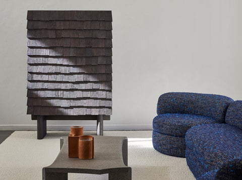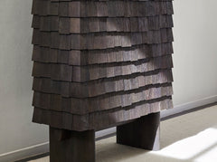 Thanks to Flavien Delbergue, this ancient technique, deeply rooted in the rural landscape, is making a striking debut appearance in the Collection Particulière catalogue in the form of a cabinet designed as a treasure chest. Completely covered in exquisite oak scales, B. Initial is an unusual, ornamental and sculptural piece of furniture, whose hues poetically and subtly evoke the passing storms and seasons.