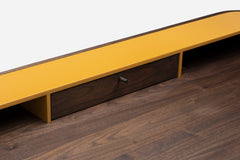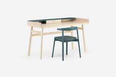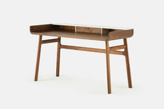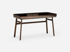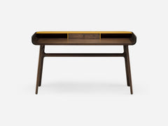 Crafted in wood with lacquer accents, Harold is a classic writing desk featuring a tabletop drawer and open storage spaces. The upward curves at the sides of the tabletop are machined from generous planks of premium timber. Slender H-frame legs joined with wedge tenons provide visual levity.
