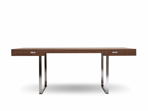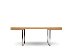 In the CH110 desk, Wegner illustrates another side of his talent for furniture design in the gathering of the table top, rails and two slender drawers into one large veneered element, resting upon two slim supporting legs in stainless flat steel. The drawers are equipped with delicate, distinctive handles in stainless steel and finished with dovetail joints. Each one is practically divided with one equipped with a small tray with a rounded bottom intended for storing small, precious things.