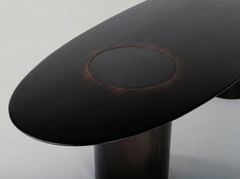 Whether circular or oval, the sensitively shaped top in fiberglass or wood contrasts strikingly with the basic steel base, formulating an interaction in which the seemingly opposite enters a harmonious relationship.