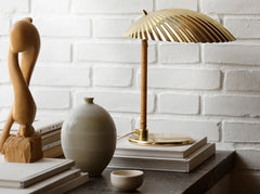 Paavo Tynell’s fanciful take on nature is gracefully echoed in the 5321 Table Lamp, designed by the Finnish designer in 1941. Under the distinctive shell inspired brass shade, the bulb subtly appears from beneath; a picturesque detail resembling the desirable sea shell pearl and making the 5321 Table Lamp a perfect example on how Tynell brought a playful nature and romance to the simplified style of mid-century modernism. Blending timeless aesthetic with a unique sense of form, the 5321 Table Lamp adds an exquisite character to complement any modern space. Both decorative and functional, the lamp is a balance of elegance and curiosity, providing a design that is at once subtle and surprising.