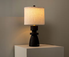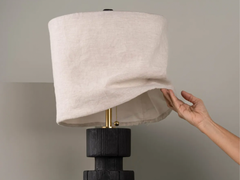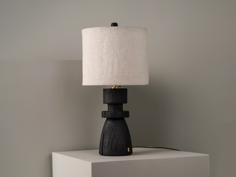 Turned pine wood base with burnt finish, flexible lampshade made with natural linen fabric