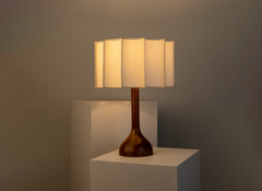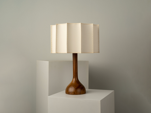 A charming table lamp, its base is like a drop of wax that melts and rests on the floor and its fluted shade is harmonious and wide.