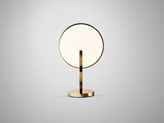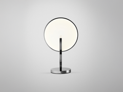 Acrylic discs supported by a mirror-polished base rotate by ninety degrees to angle the diffusion of light and reveal multiple silhouettes.