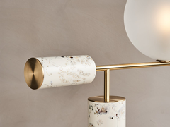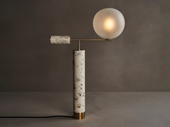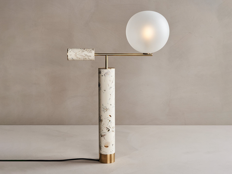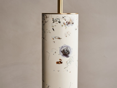 Flora Lamp I is a balanced composition of geometric cantilevered shapes, composed of brass, glass, and our unique Flora Perma material. A glass globe offsets the body, offering a soft dimmable light source. The body of the lamp is carefully machined to reveal the intricate and complex beauty of the cross sections of flowers, curve of petals, structure of leaves. Contrasted with white resin they appear as veins or fossils creating an almost stone like quality.