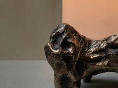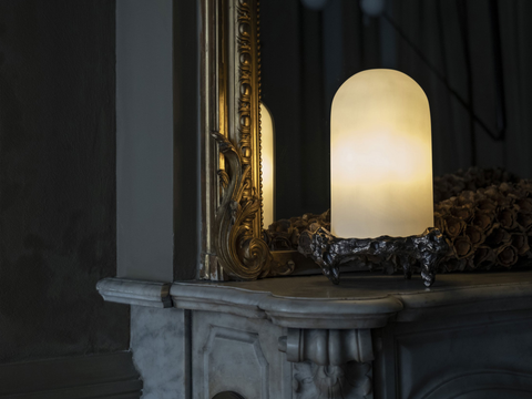 Like an artifact from the past weathered by time, Nova is a piece that seems to have crossed the ages. Its delicate matte white dome contrasts with the textured cast bronze plinth. Like sleeping stars, in the dark it reveals all its power. The porcelain glows with an incandescent light revealing the delicate, mineral texture of the porcelain.