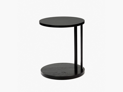 The solid wood Aura side table features two circles laid flat to form the top and bottom, connected by a slender curved pillar and a thin cylindrical column that sit parallel to each other towards the outer edge of the form.