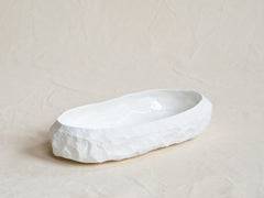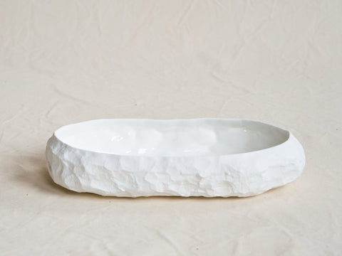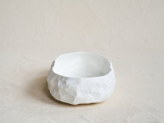 A collection of fine bone china tableware slip-cast from plaster models carved by hand, with glazed interior for functionality and raw exterior reflecting the modest surface texture of the plaster original.