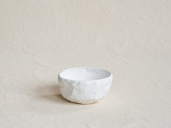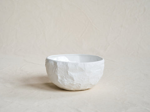 A collection of fine bone china tableware slip-cast from plaster models carved by hand, with glazed interior for functionality and raw exterior reflecting the modest surface texture of the plaster original.