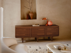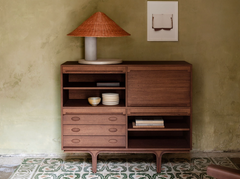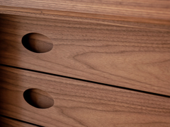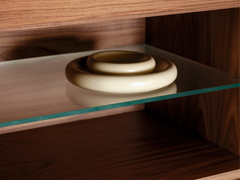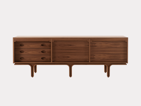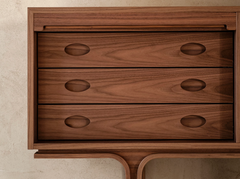 Thee sideboard, Model 500/3, with three container elements with shutters and the high sideboard, Model 500/4, with two-plus-two shutters, were designed following a concept of modularity, which begins with a bench element – a curved wooden base strengthened by a T-shaped element that makes it non-deformable – and then involves the addition of various modules in length and height.