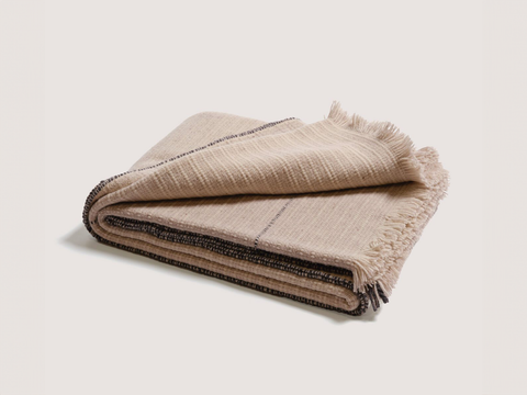 An evenly designed soft textured, smooth bed blanket. Reversible, traceable 100% ecological Merino wool in the raw and greys tones of the wool’s natural yarn. Four coloured patches and mixed textures breathe life into this blanet that works best in neutral spaces. With charcoal grey edging for the underside of the blanket and a fringe around the edges.