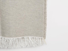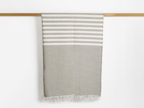 Camille has clear, crisp lines and a slubby textured fabric. The design is a grey/flax base with 1-inch oyster stripes. The throw is finished with a 1.5-inch fringe edge. Beige with white stripes, heavy weight.