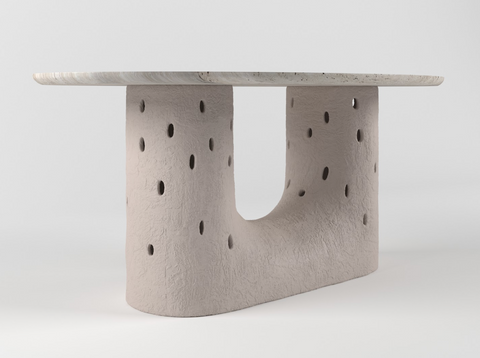 ZTISTA table — the leg, hand-sculpted of FAINA’s eponymous material — ZTISTA a sustainable blend of clay, hay and other recycled materials, designed to one day return to nature. ZTISTA is about tactility, pure energy, gut feelings. Spontaneous and emotional, ZTISTA table features a living ash-wood top and signature holes.