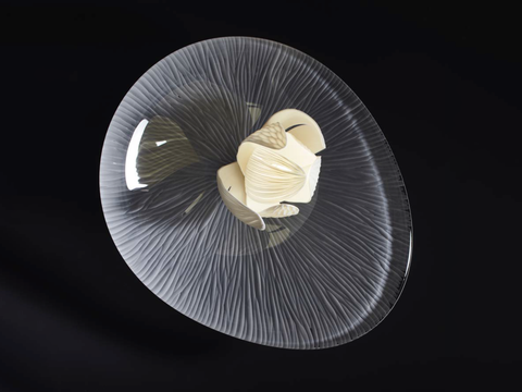 Taking inspiration from their Taiwanese influences Lotus light is a ceramic and glass wall and table light launched at Collect 2020 Somerset House with Ting Ying gallery. Lotus flower is a symbol of beauty, purity and it is often seen in the green land of Taiwan. Fine hand carved porcelain petals sit on an engraved glass pad. The light filters through the ceramic and shine onto the glass, creating reflections similar to those seen on the water.