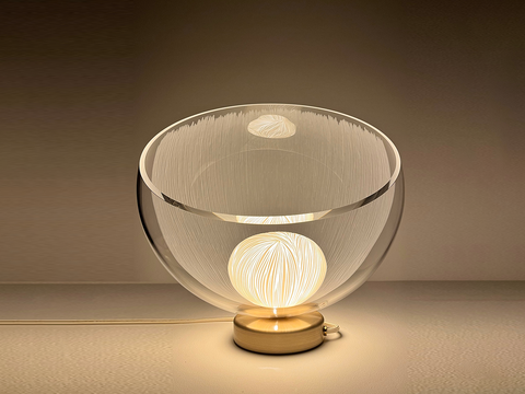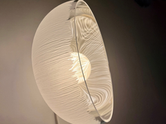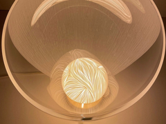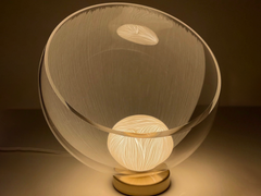 Made entirely by hand by Cristina Vezzini and Stan Chen in their London studio. Each blown glass semi-sphere is carved in half with different textures. The central part of the lamp, made of porcelain is also hand carved to create further texture to diffuse the central light source.