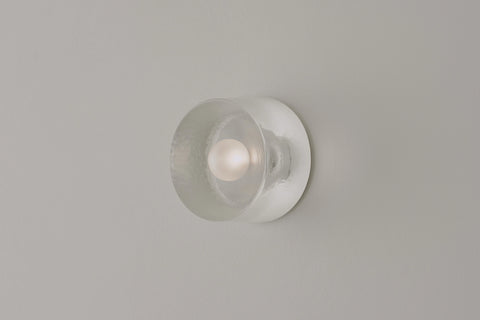 Glass Anton Mini is cast from solid clear glass, resulting in the unique textural variations through which the light gently diffuses onto the mounting surface. Backing plate finish specifiable.