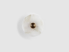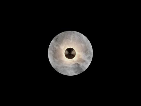 The translucent alabaster planes of the Median Series are intersected by a fluted brass form, referencing traditional Middle Eastern jewelry while pushing it through a futurist lens. The stone glows from a light source that remains hidden, illuminating the relationship between the solid and the permeable.