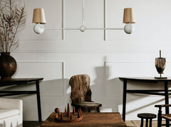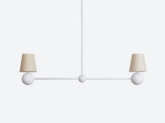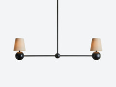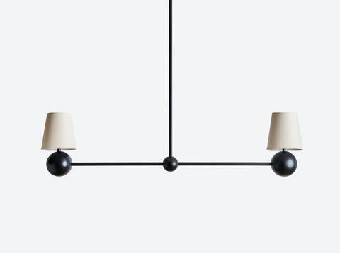 BOLE PENDANT II is a visual balancing act. A seemingly delicate linear armature floats two robust spheres and their accompanying shades. Evenly distributing light across a broad expanse this pendant lends both weight and levity to myriad installations.