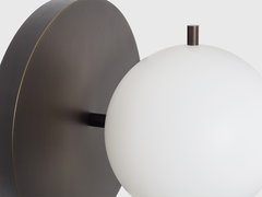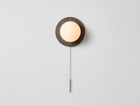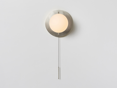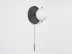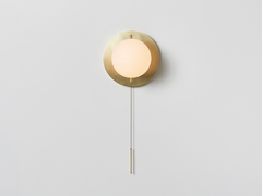 The Signal Sconce features a hand blown globe. The fixture is delicately mounted between two metal pins above a luminous canopy, creating a hieroglyphic composition. A pull chain holds a slender rod, giving the piece a jewel-like presenc