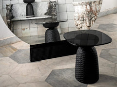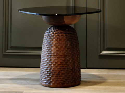 Nera Coffee & Side Tables are a part of Zanat’s extraordinarily popular Nera collection that also includes stools and bowls. The tables consist of a top in stained glass and a sculptural hand-carved base made in solid European hardwoods. The choice of different carving patterns, woods and finishes enables one to customize the product. The tables are suitable for use in both residential and commercial/public settings.