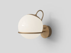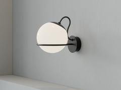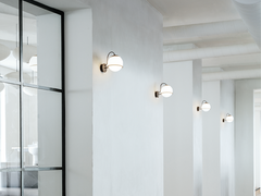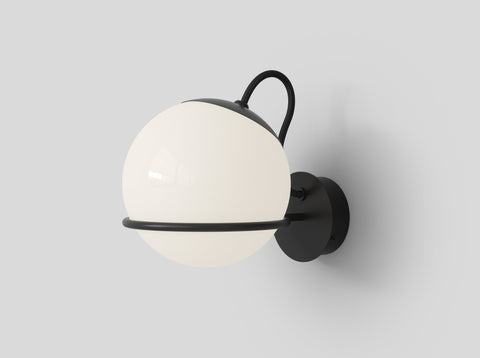 The single blown opaline glass sphere is gently held by a black or champagne painted steel ring. The steel ring has a small cut, enabling the sphere to be placed facing downward or upward and thus providing a direct or indirect light composition.