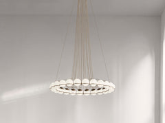 The Le Sfere Chandelier is composed of a circular array of blown opaline glass spheres. Each sphere is held in place by a large Black or Champagne painted steel radial ring structure. The spheres can be oriented downward or upward to provide direct or indirect illumination.