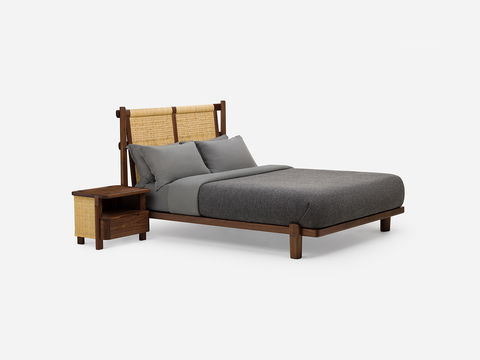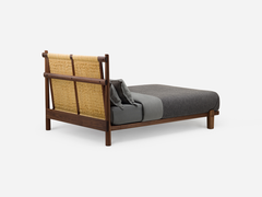 Inspired by the work of Carlo Scarpa, Charlotte Perriand and Josef Frank, Twenty-Five Bed features a special edition woven headboard made from junco, a material commonly used in Portugal to make baskets and handbags. Rather than working with a pre-fabricated mat, De La Espada uses the timber frame of the headboard as a loom upon which the junco is woven, with Danish paper cord used for the warp. As the junco is naturally relatively short in length, the back of the headboard features the cut ends of the grass, highlighting the material's nature and the laborious handwork that goes into creating each unique piece.